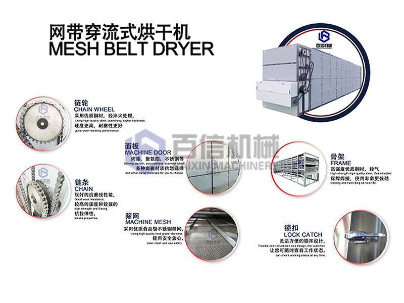 被加工物料采用多層移動式不銹鋼網帶傳送,熱氣流自下而上穿流網帶及其上的物料層,多層新歡翻轉,逐層烘干,熱質交換均勻、充分,生產效率高,產品質量好。